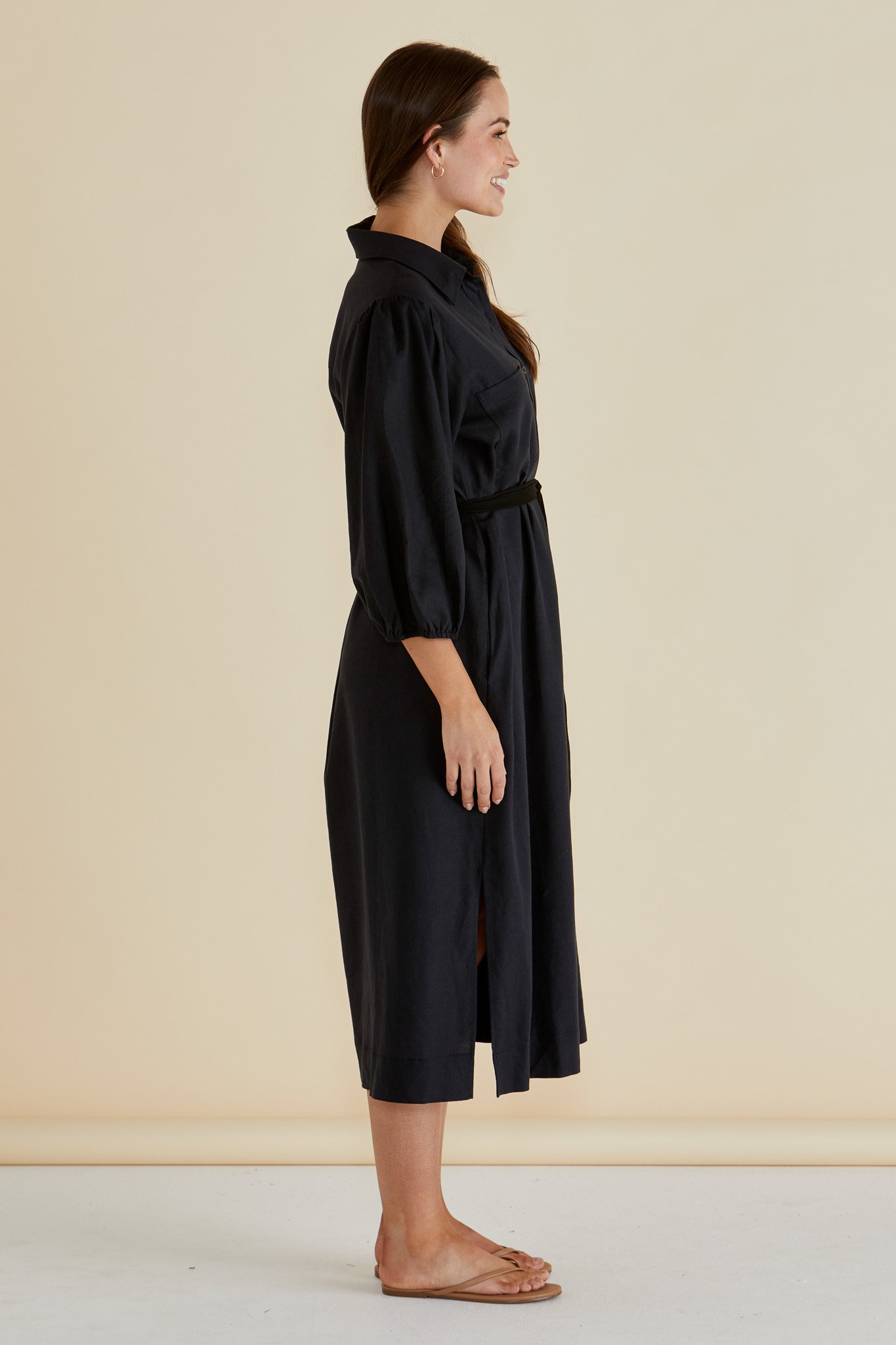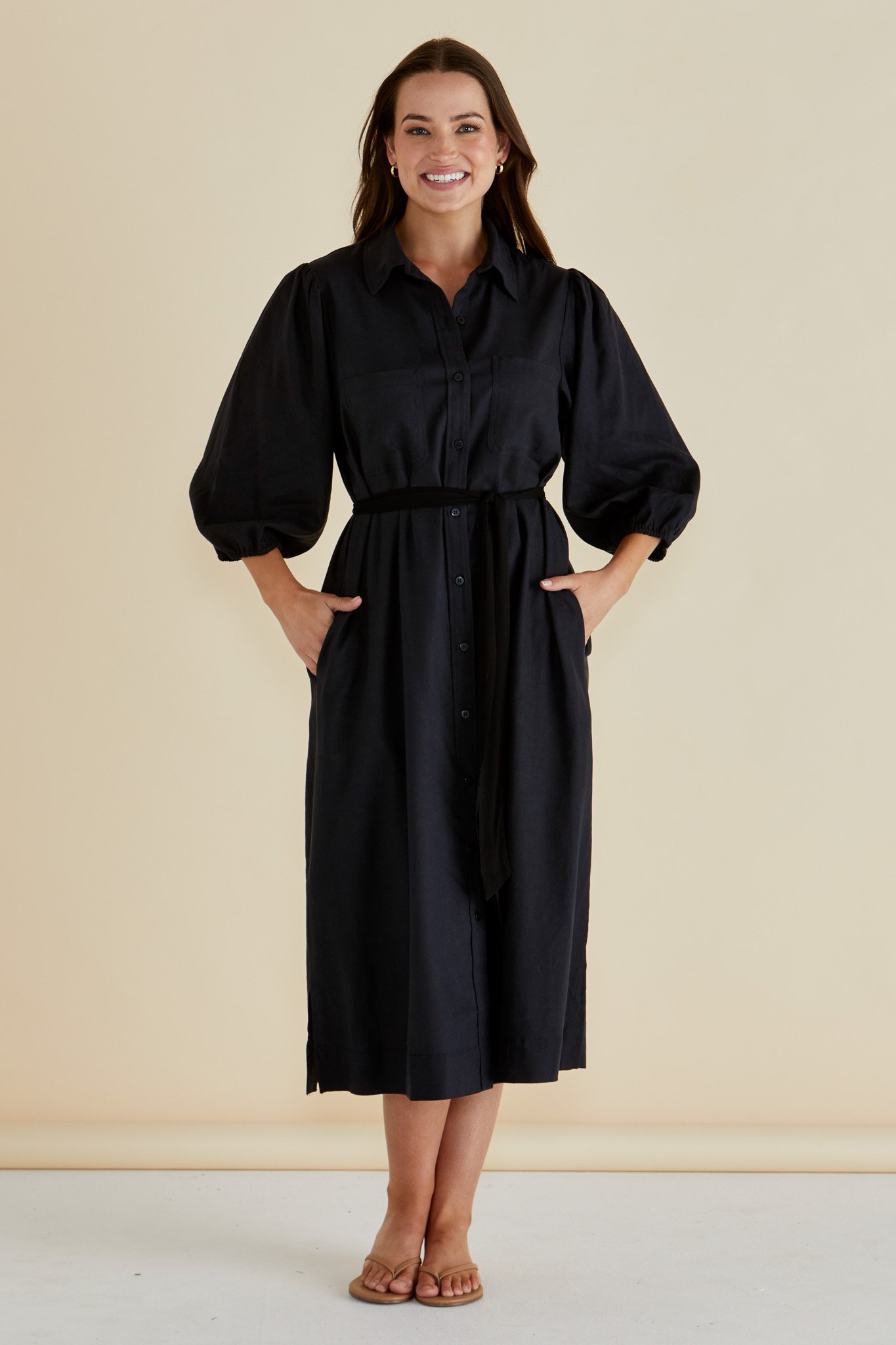 The Angelina Dress is a refined choice for the modern woman, crafted in a viscose blend that feels soft and comfortable. Its billowing sleeves and detachable waist tie create an elevated, classic silhouette. The button-up front and relaxed fit make it an effortless transeasonal staple that exudes sophistication and ease.