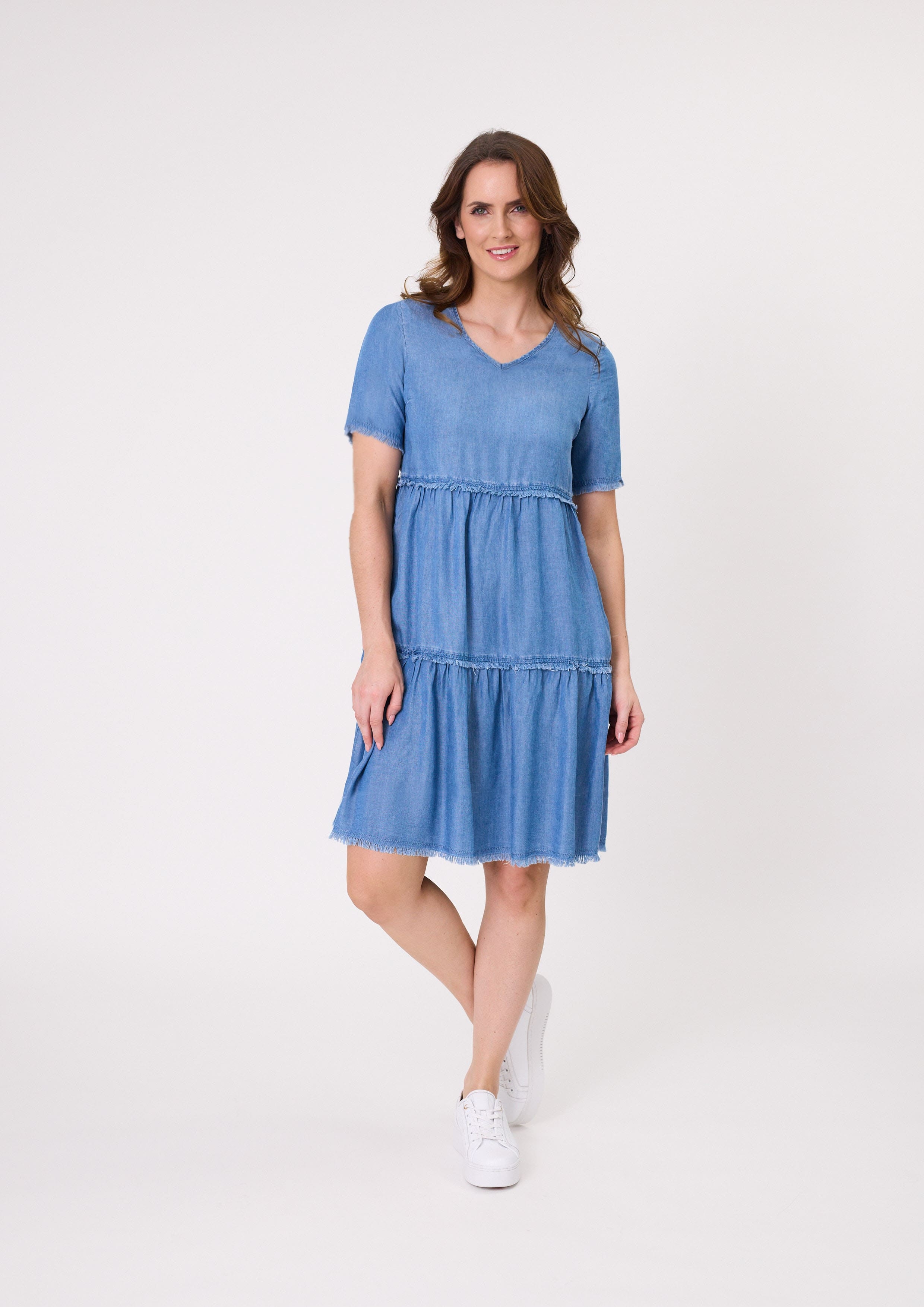 • Features V-neckline and a tiered skirt with frayed edges for casual charm.