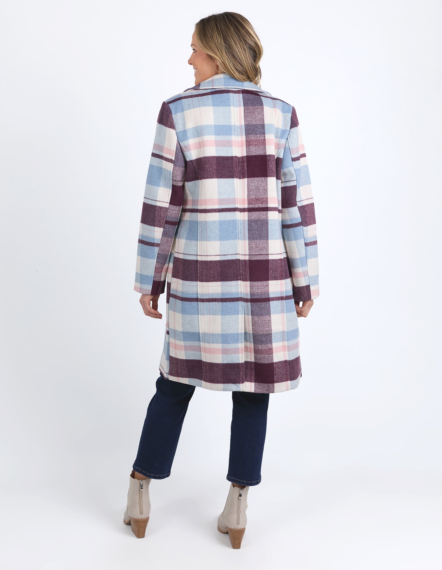 The Blanche Check Coat is a fabulous statement coat for cooler weather. It features a wide lapel, knee-length fall, long sleeves, hip pockets, and contrast lining.