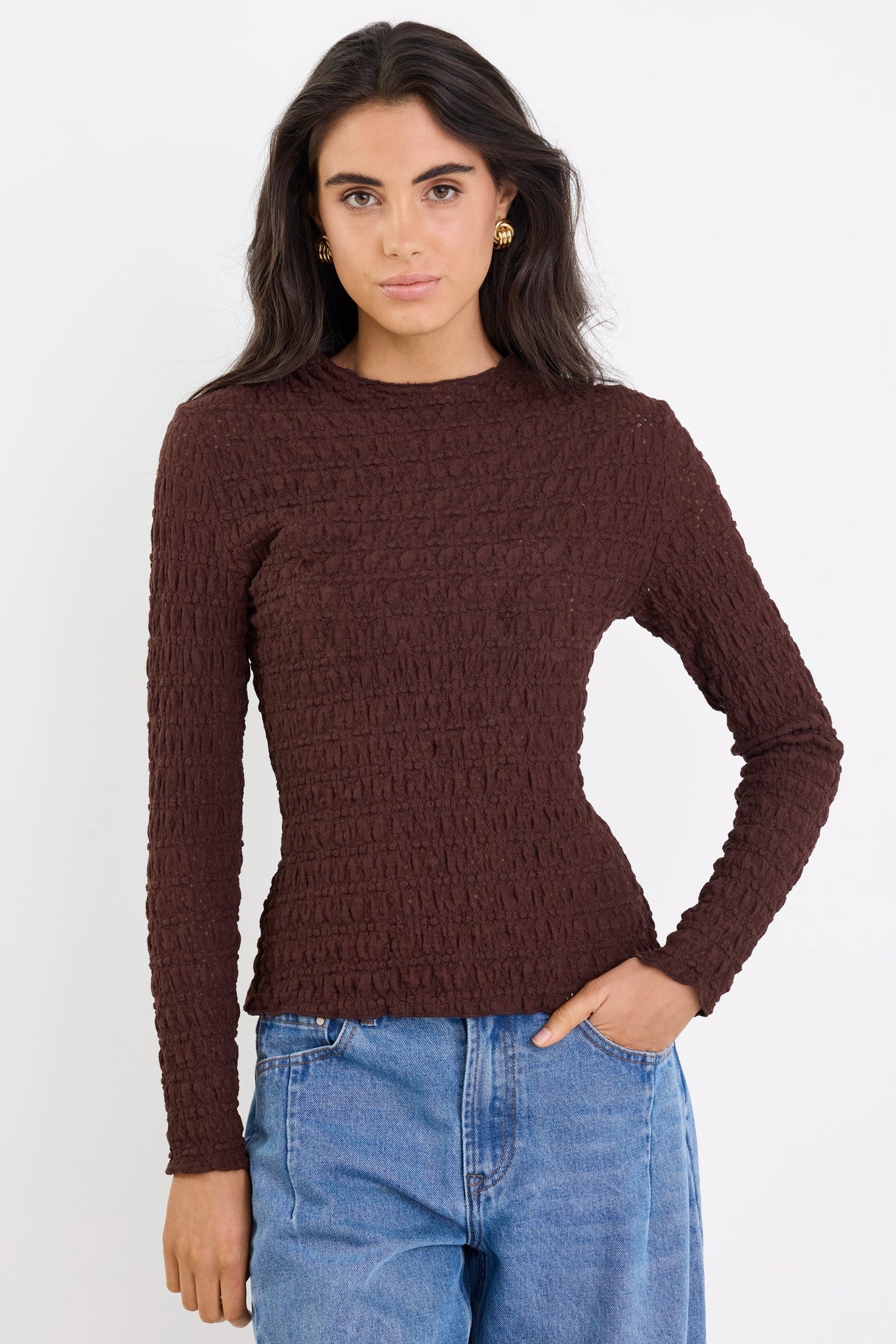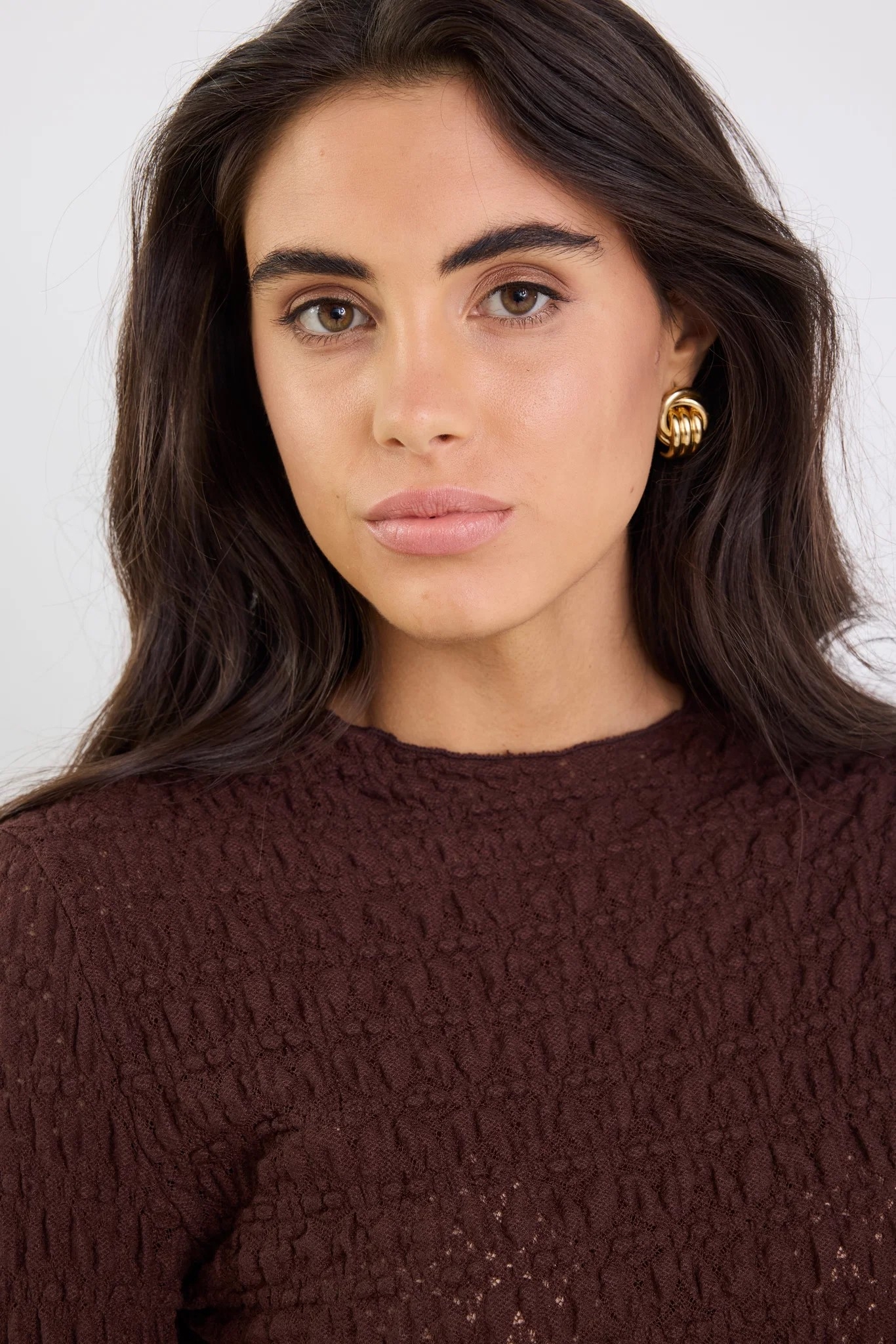 The Captive Chocolate Lace Top is your new go to for effortless elegance. Crafted in a soft cotton blend with a delicate textured finish, it gently hugs the body while the subtle funnel neck adds a refined touch. Fitted yet comfortable thanks to a hint of stretch, this piece feels as good as it looks and layers beautifully across seasons.