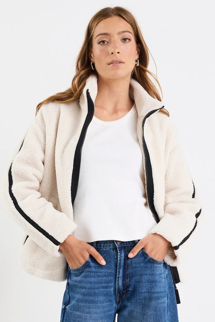 Stay warm and effortlessly stylish in this plush sherpa jacket. Designed with a relaxed, oversized silhouette, it features a contrasting zip closure and collar for a modern, sporty touch.