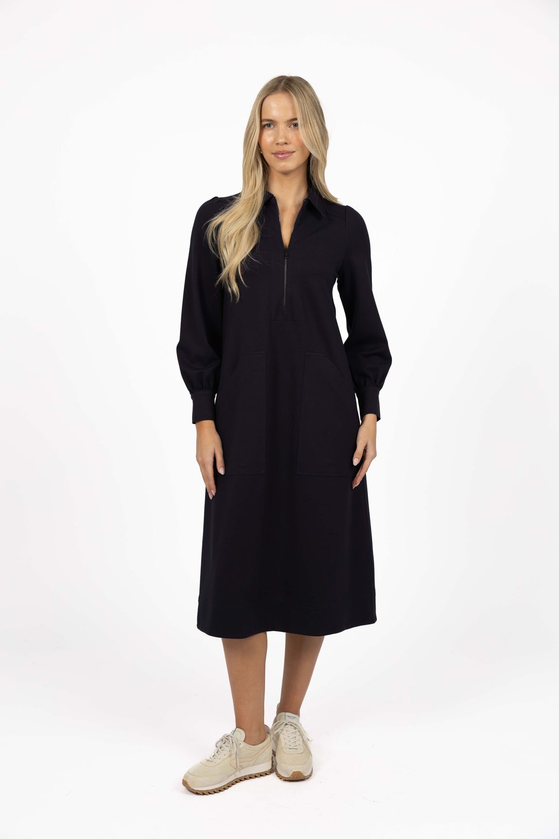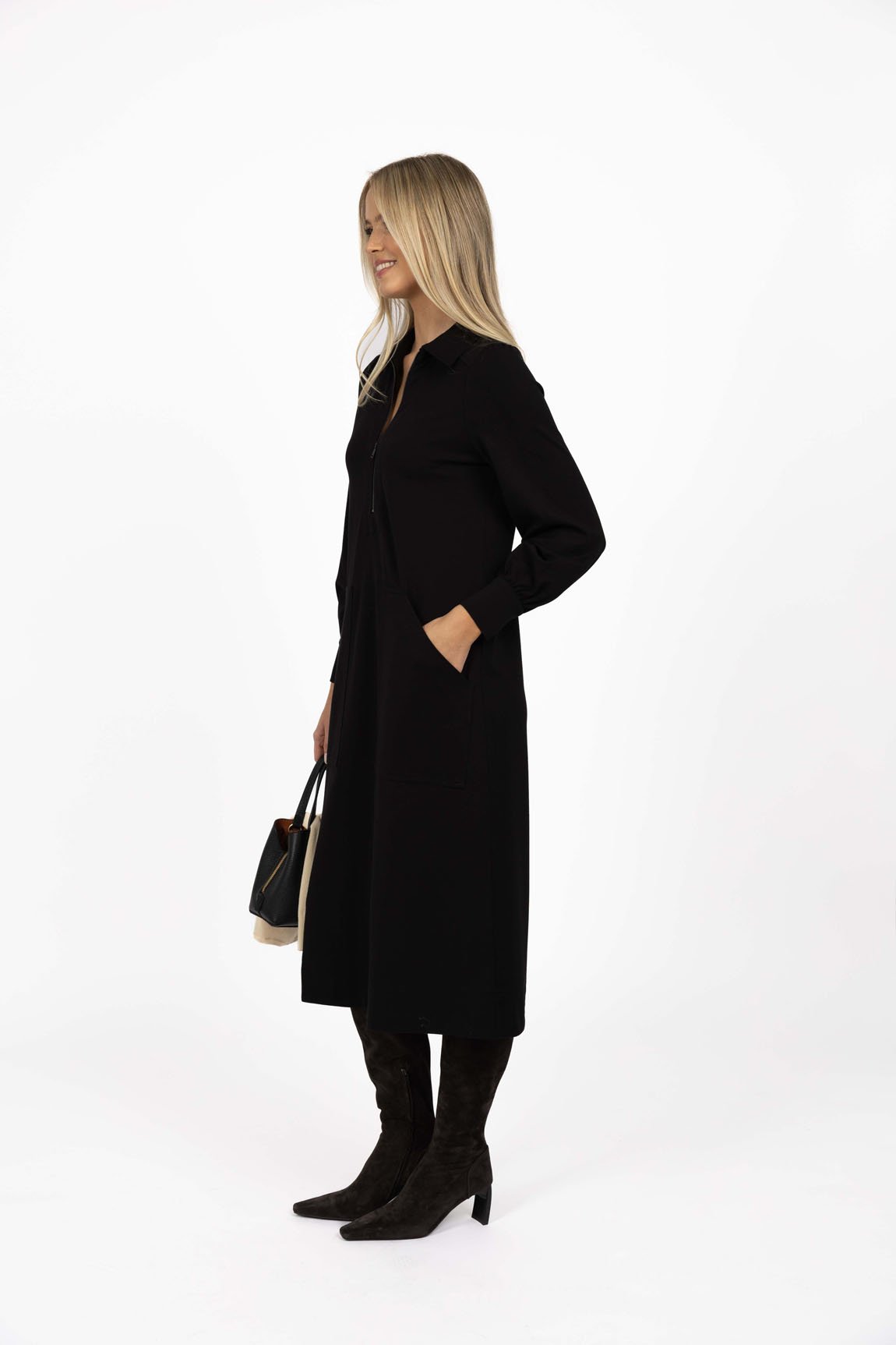 Midi length dress with front pockets, zips part way down the front, back split, collar, domes on the cuffs and a slight puffed sleeve.