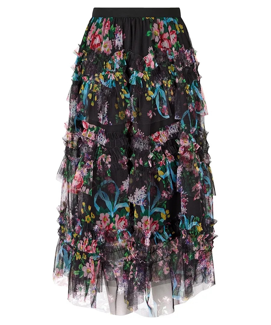 This mesh midi skirt will bring mystery and romance to your autumn wardrobe. A feminine look with a dark edge, we love the texture and movement from its pretty tiered ruffles. Perfect for a seasonal occasion or an evening out, you can pull out its colourful florals with bright, bold accessories.