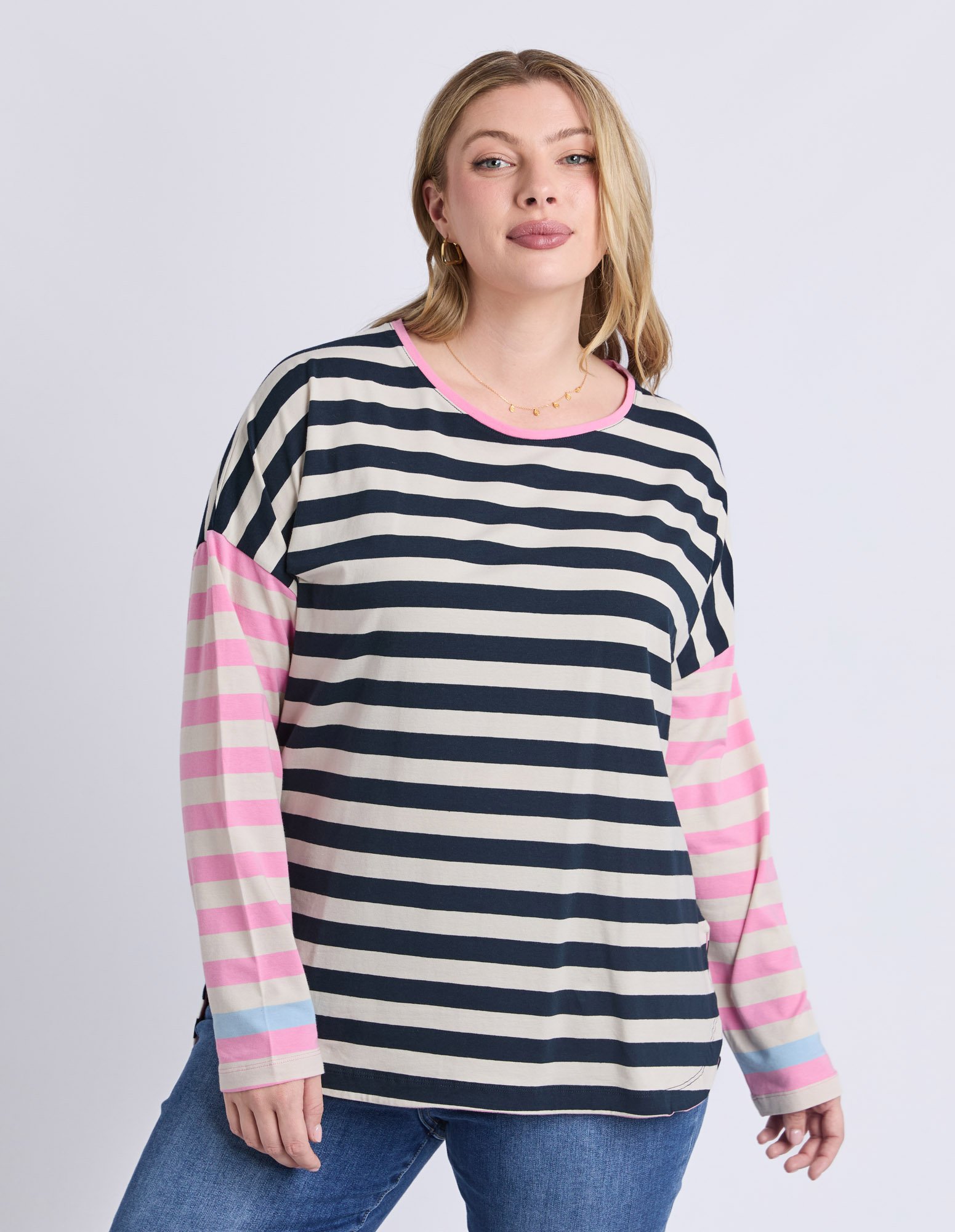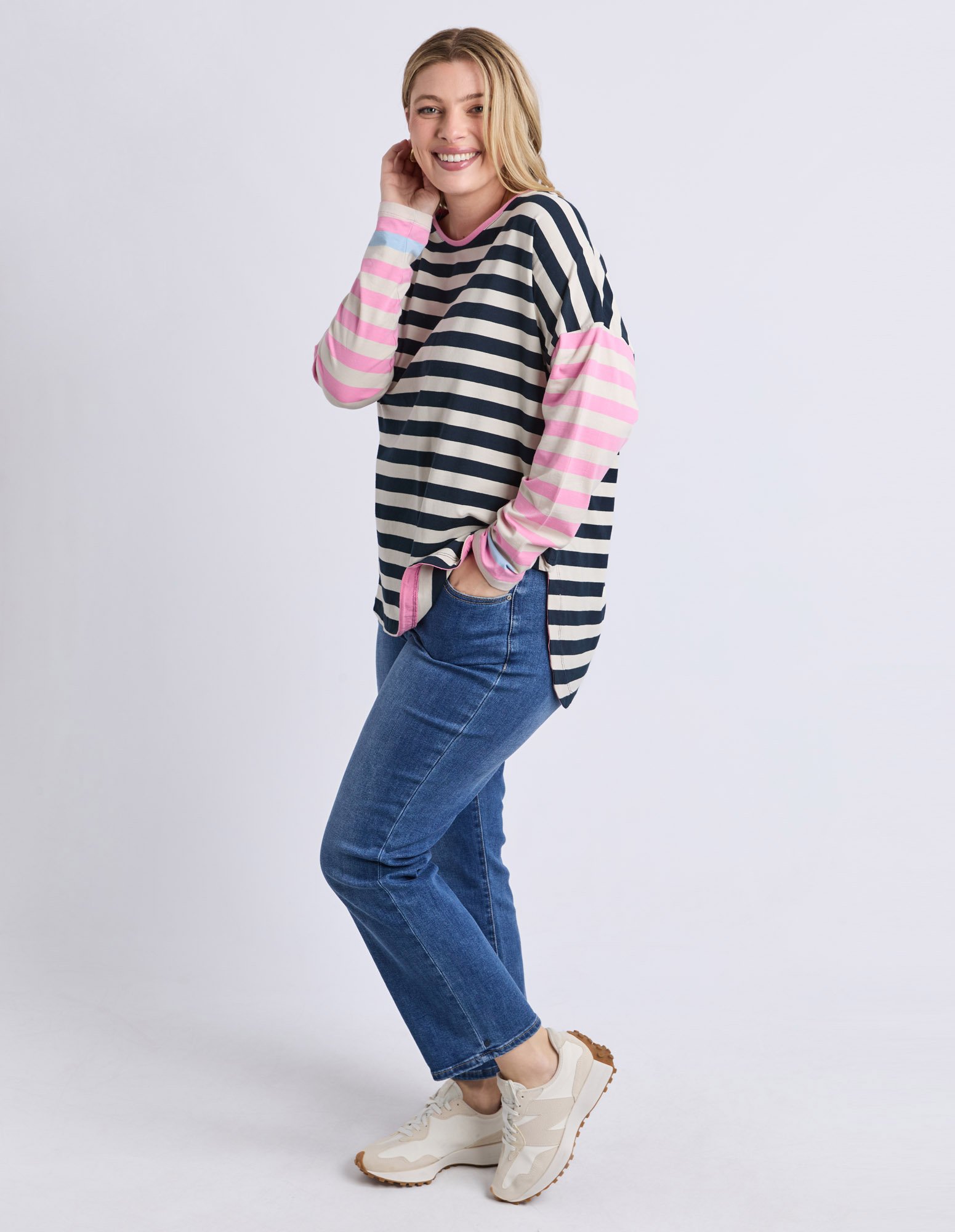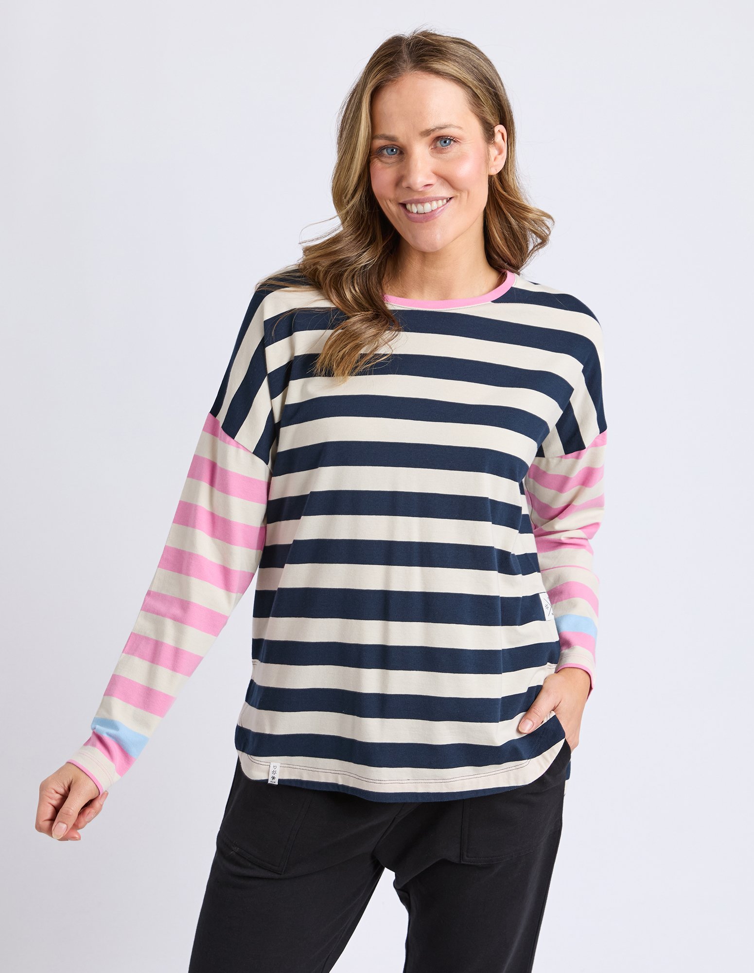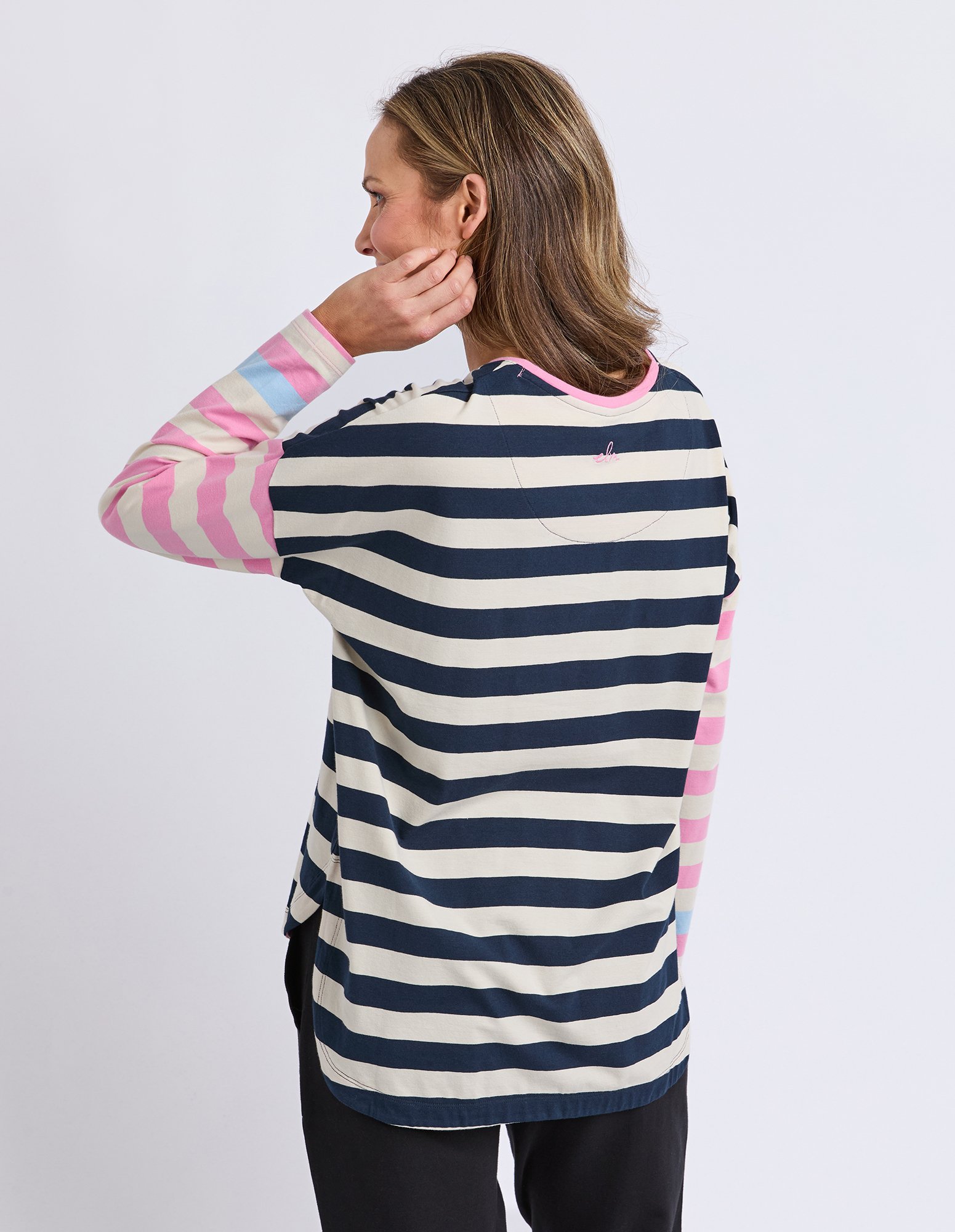 The Elm Gaeb Stripe Long Sleeve Tee is a versatile everyday essential featuring yarn-dyed stripes and a relaxed fit. Crafted from soft stretch cotton jersey, it includes a flattering back hem drop for added coverage. Pair with denim or relaxed pants for effortless, all-day comfort.