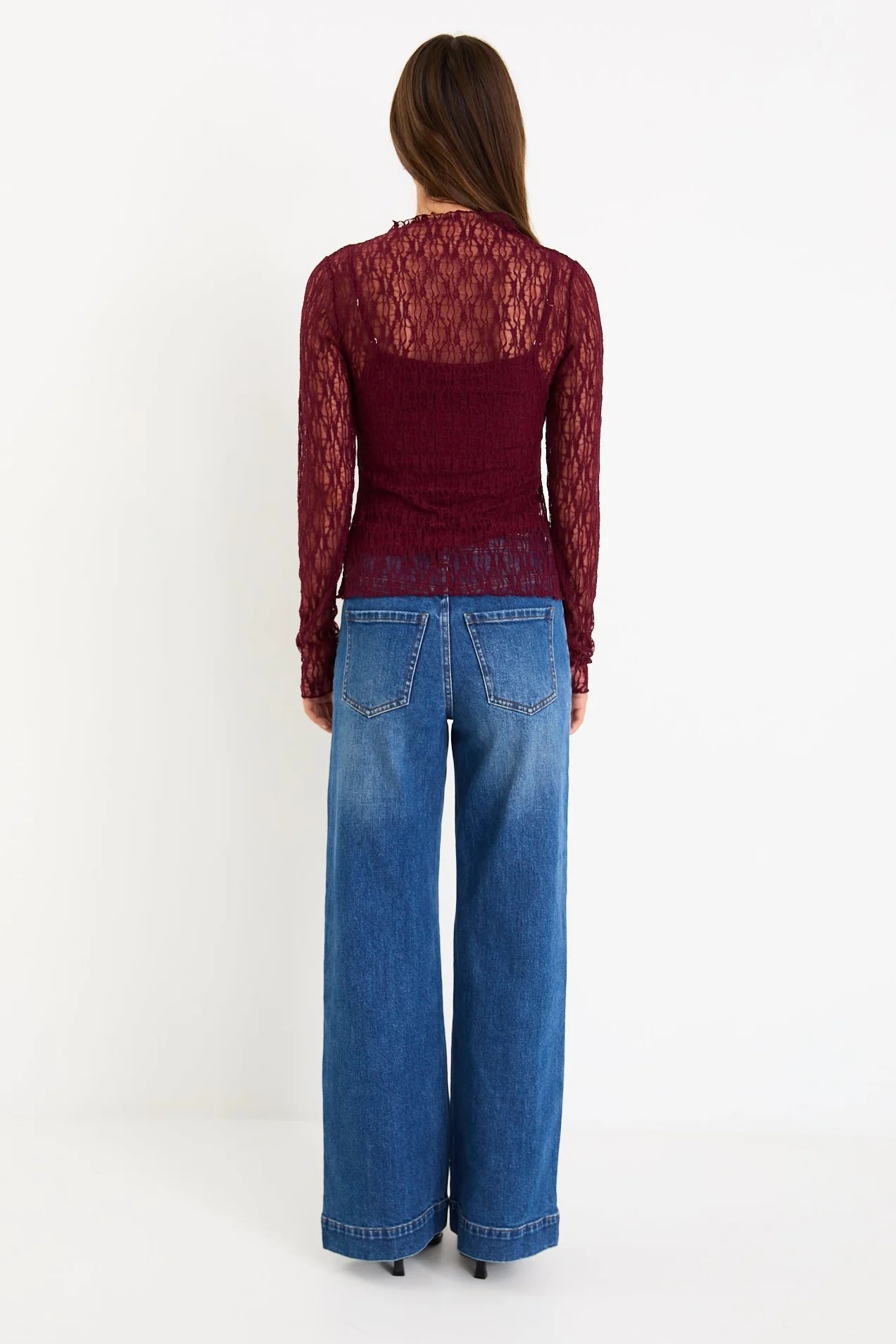 The Giving Top brings a romantic feel to your everyday styling. Designed in a deep burgundy lace, it layers a sheer long-sleeve overlay over a soft matching cami so you get coverage and comfort without losing that delicate, textural finish. It’s the kind of piece you can dress up with tailoring or keep casual with your favourite denim.