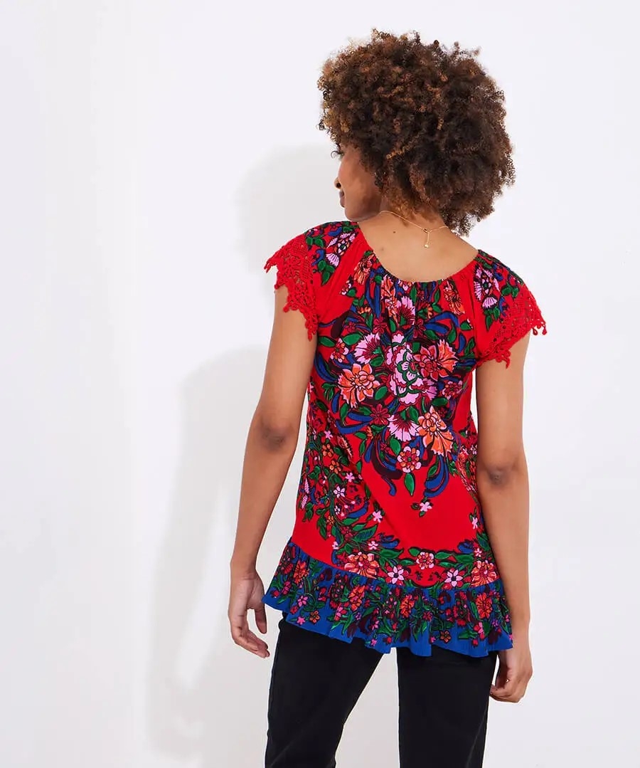 Grab this bold boho top and dive into summer style. Bringing floral accents and a lace trim to our best selling shape, it creates the most flattering silhouette. Not to mention the crinkle fabric is so easy to care for, so whether you hang it up or pack it in your suitcase, it'll always be ready to wear.