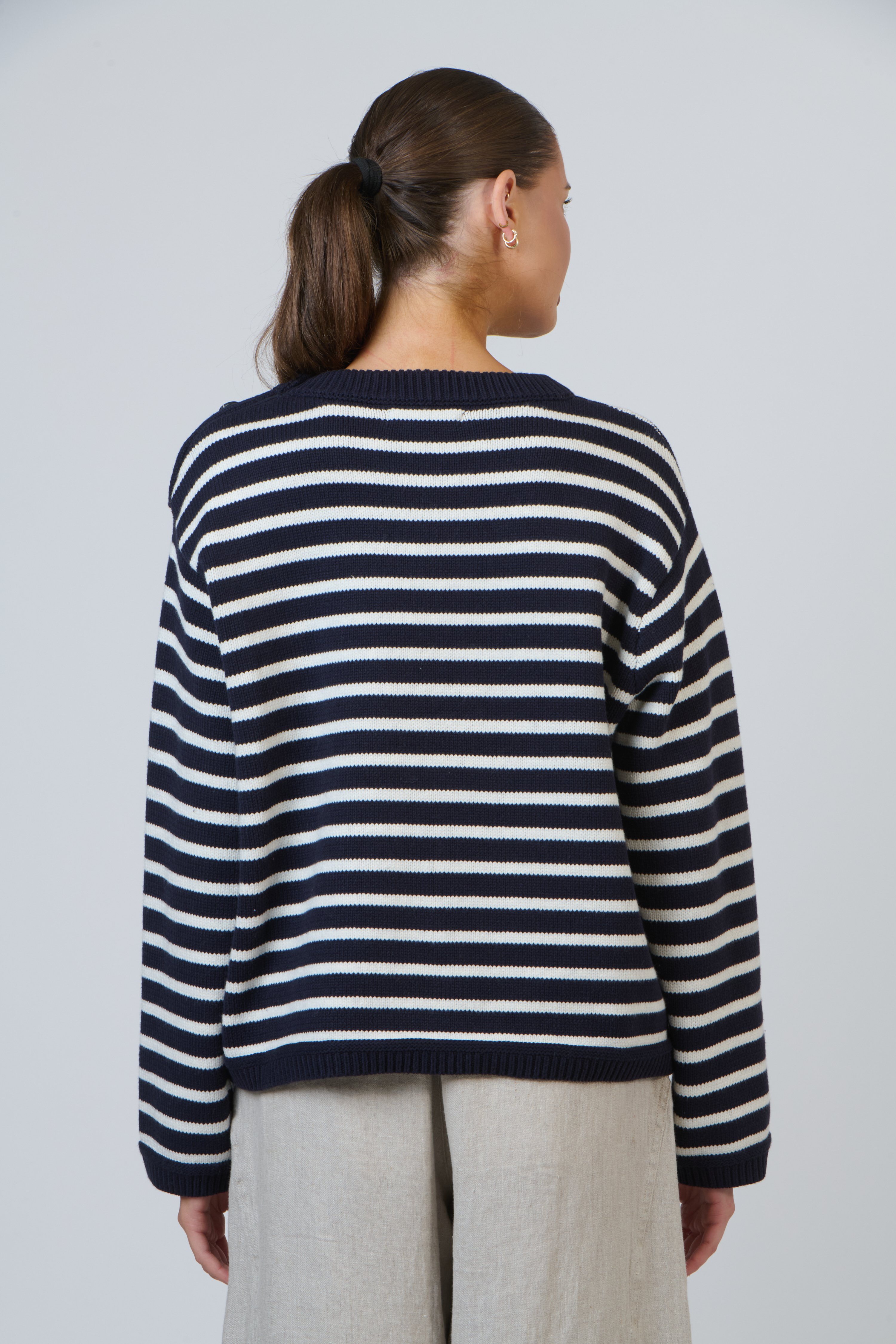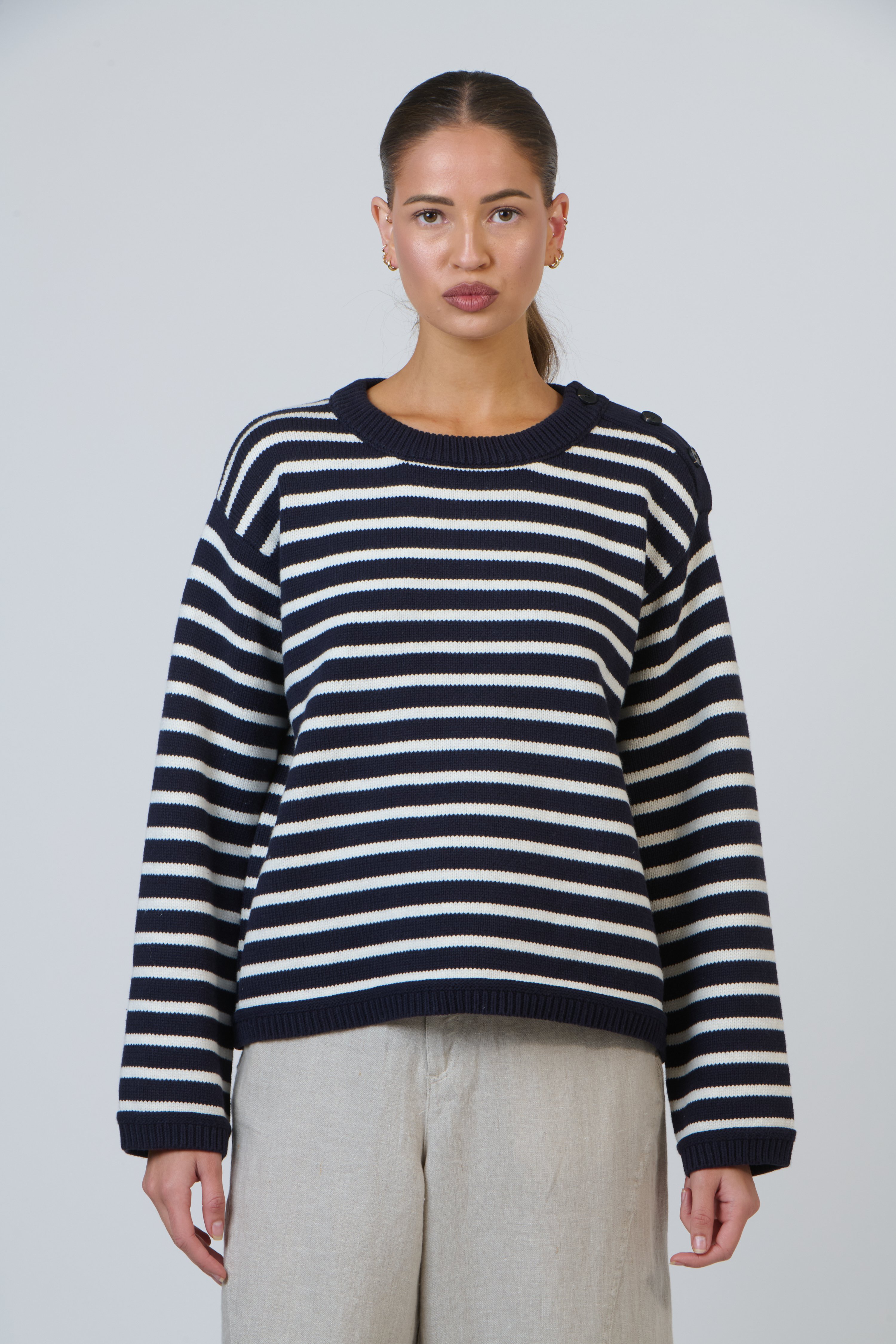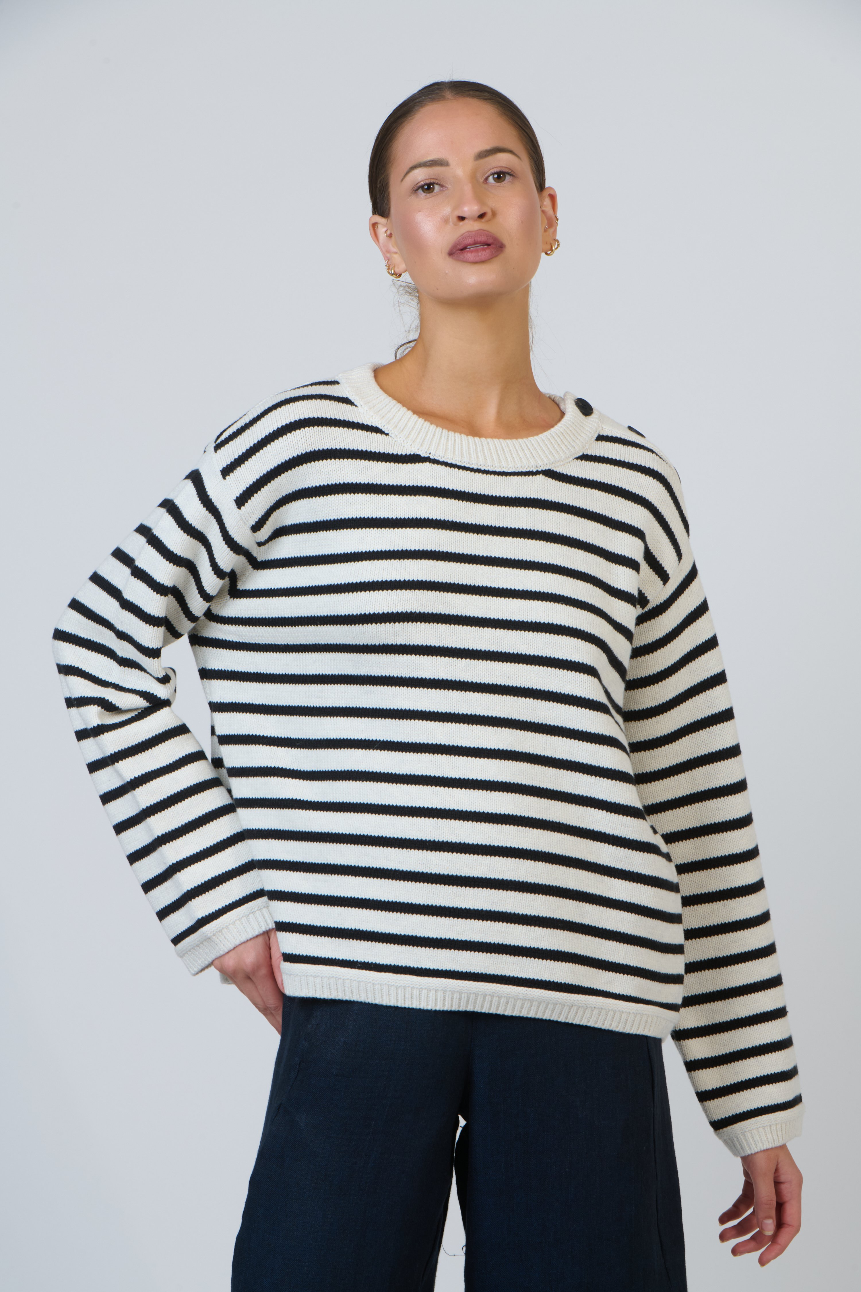 An easy essential that brings effortless polish to casual looks.  Offering a relaxed fit with a classic crew neckline, ribbed finishes, and dropped shoulders for comfortable movement. The horizontal stripe pattern and rib-knit texture give it a modern nautical feel, complemented by subtle shoulder button detailing. Ideal for styling with denim, skirts, or layered over shirts.