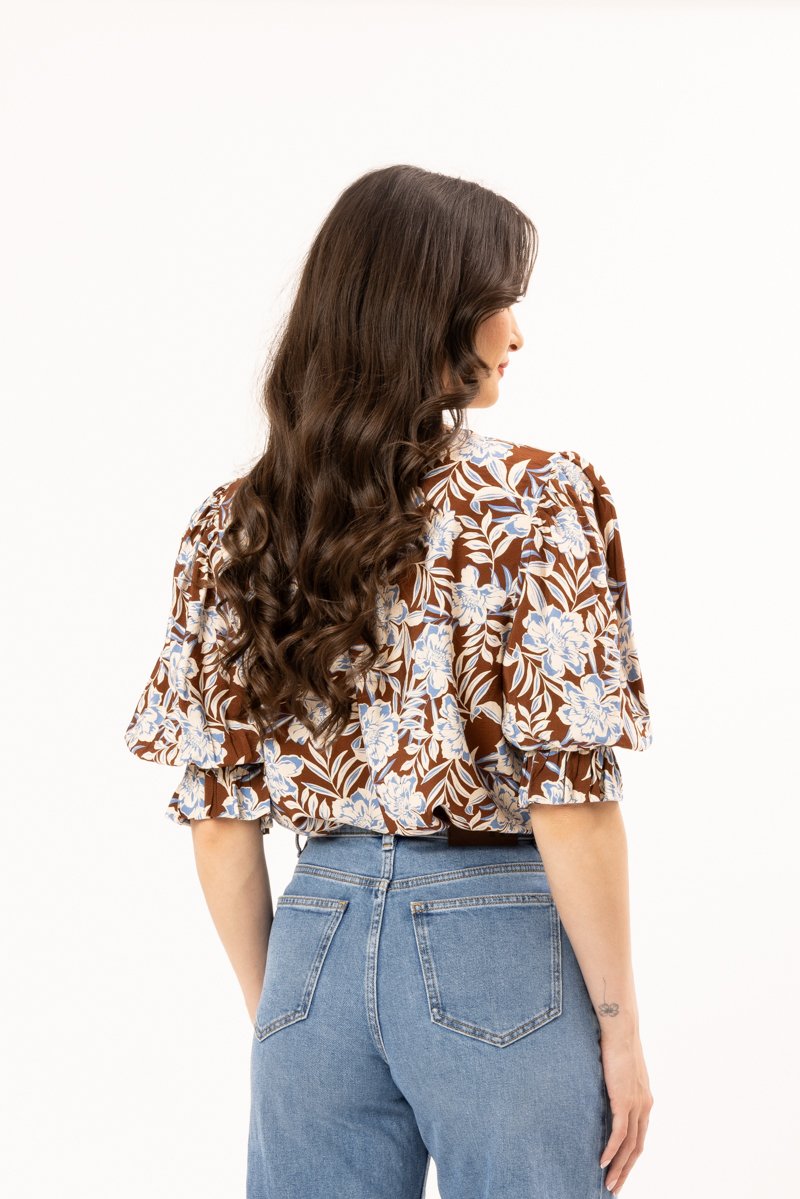 Easy fit blouse with elasticated sleeves, curved hem, a keyhole and button do up at the back.