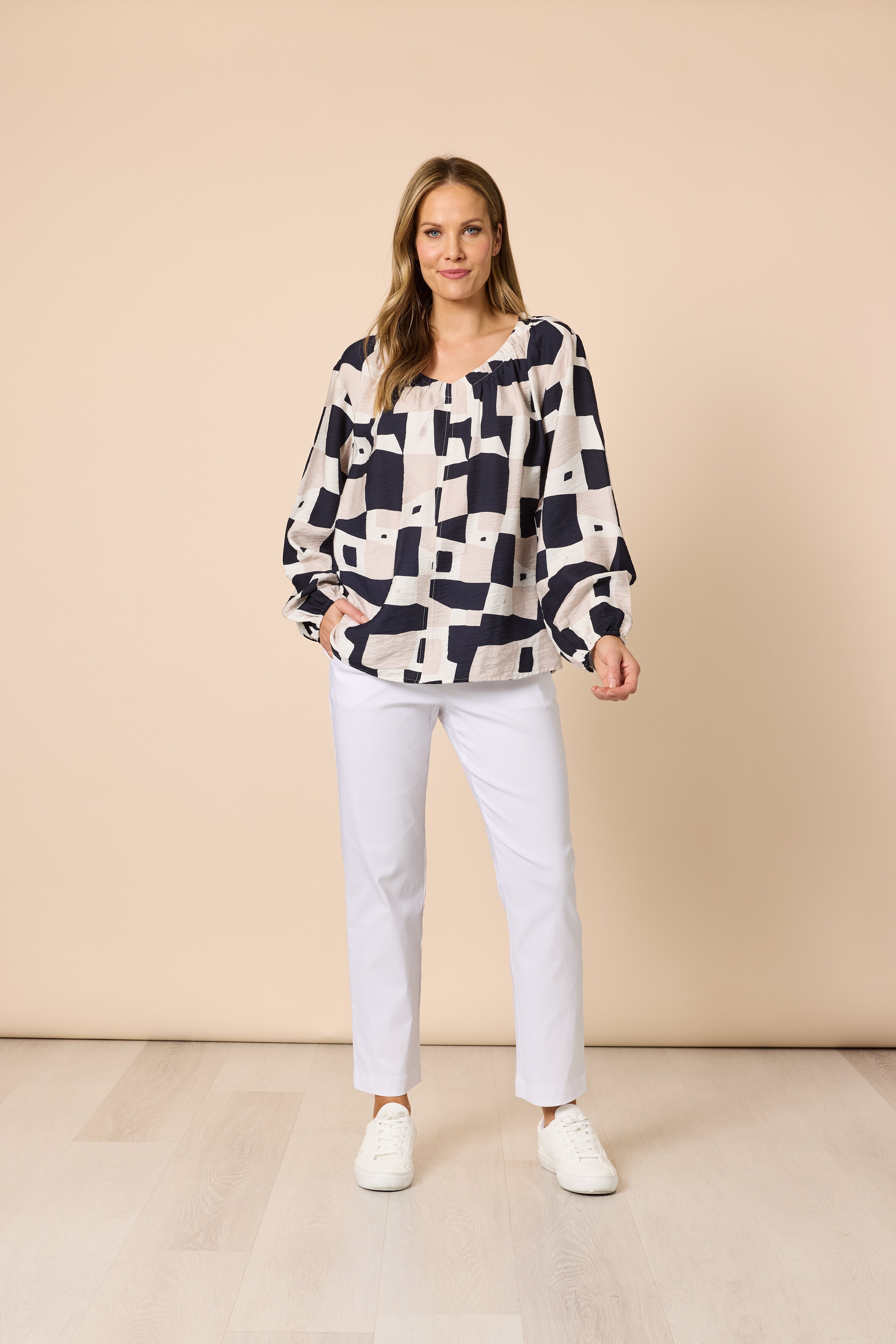 Gorgeous geometric print. Elasticated sleeves.