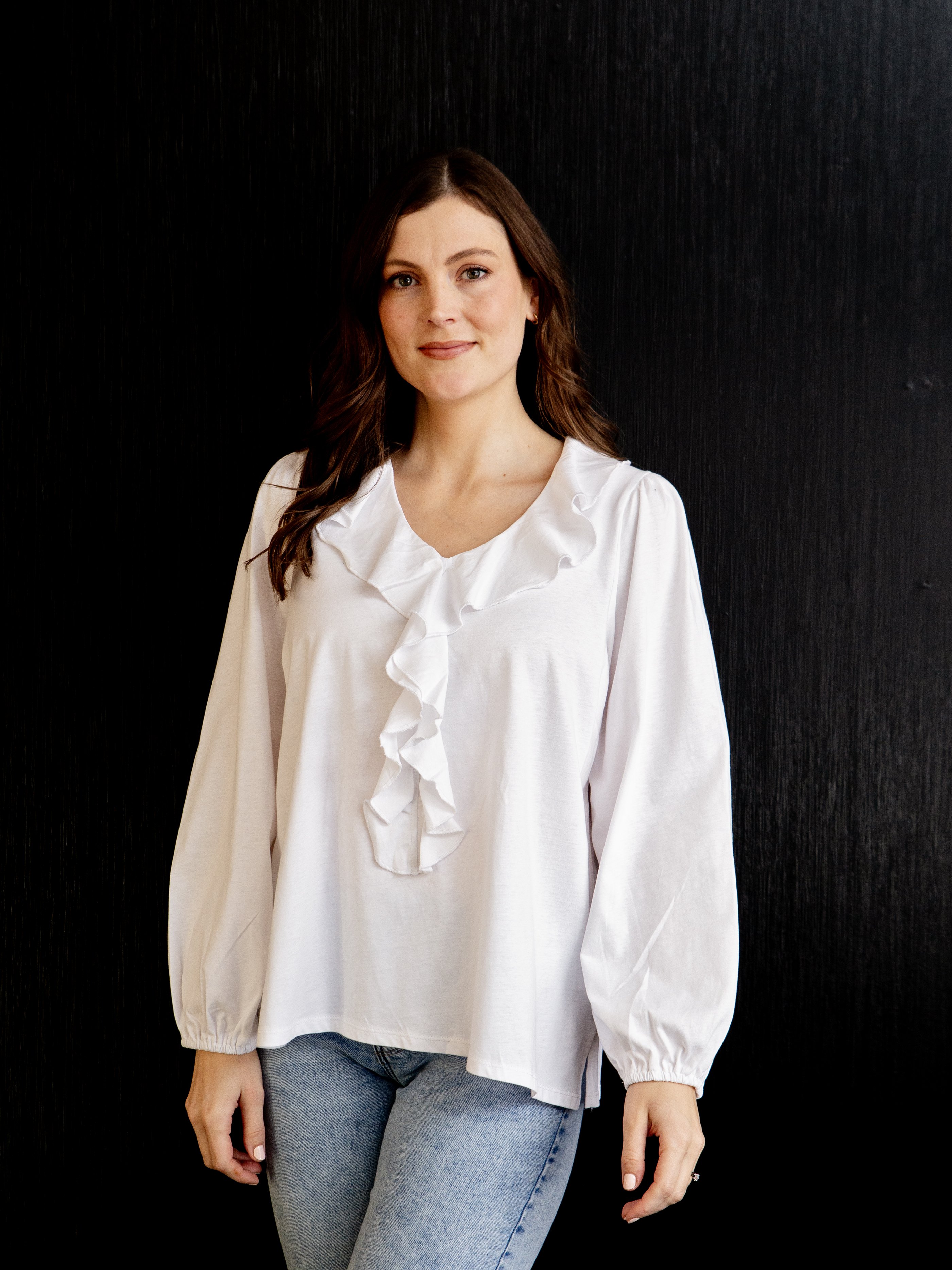 White On Black-Ruffle V Neck Top