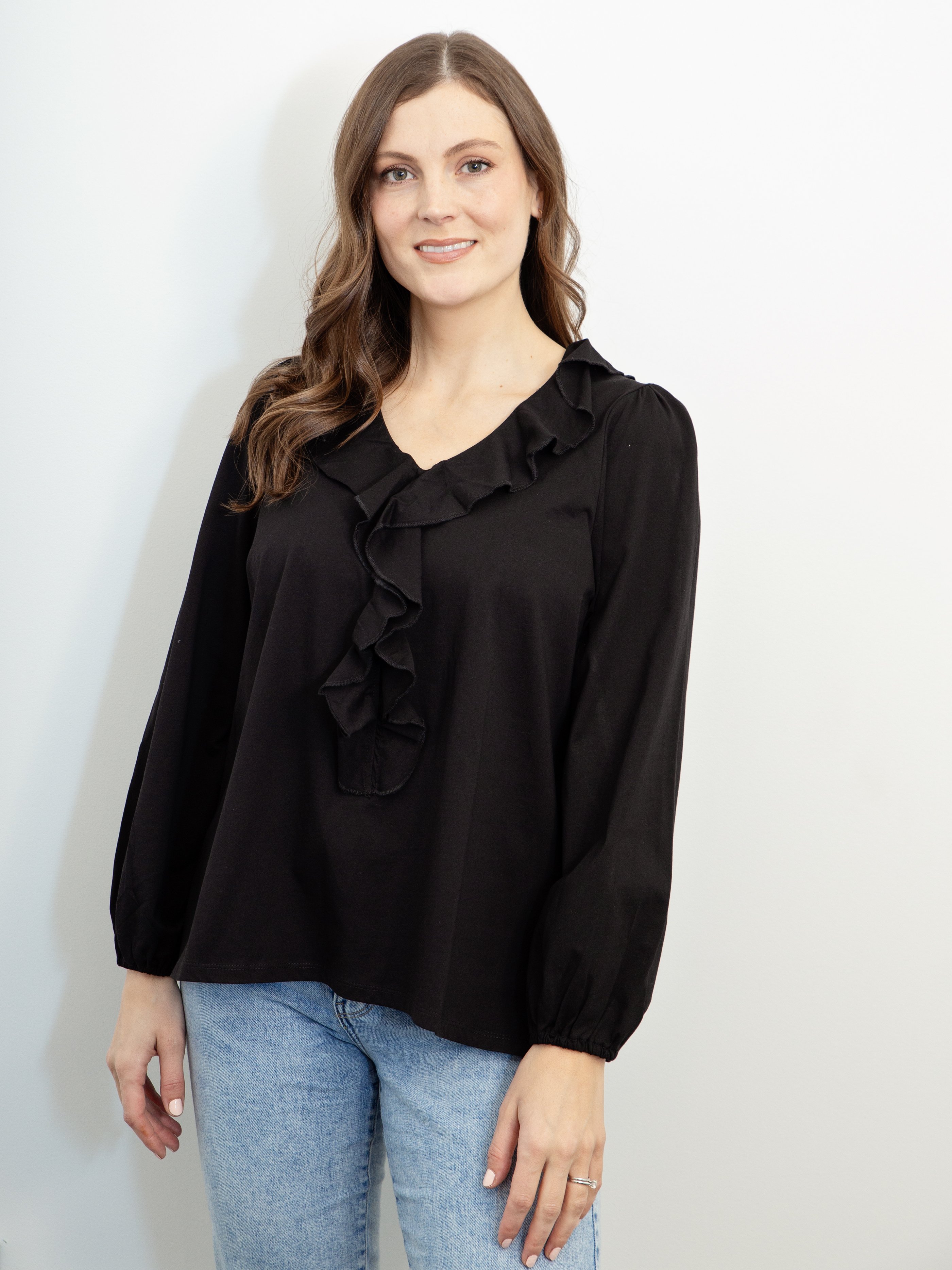 Ruffle V Neck top with side splits and elasticated cuffs.
