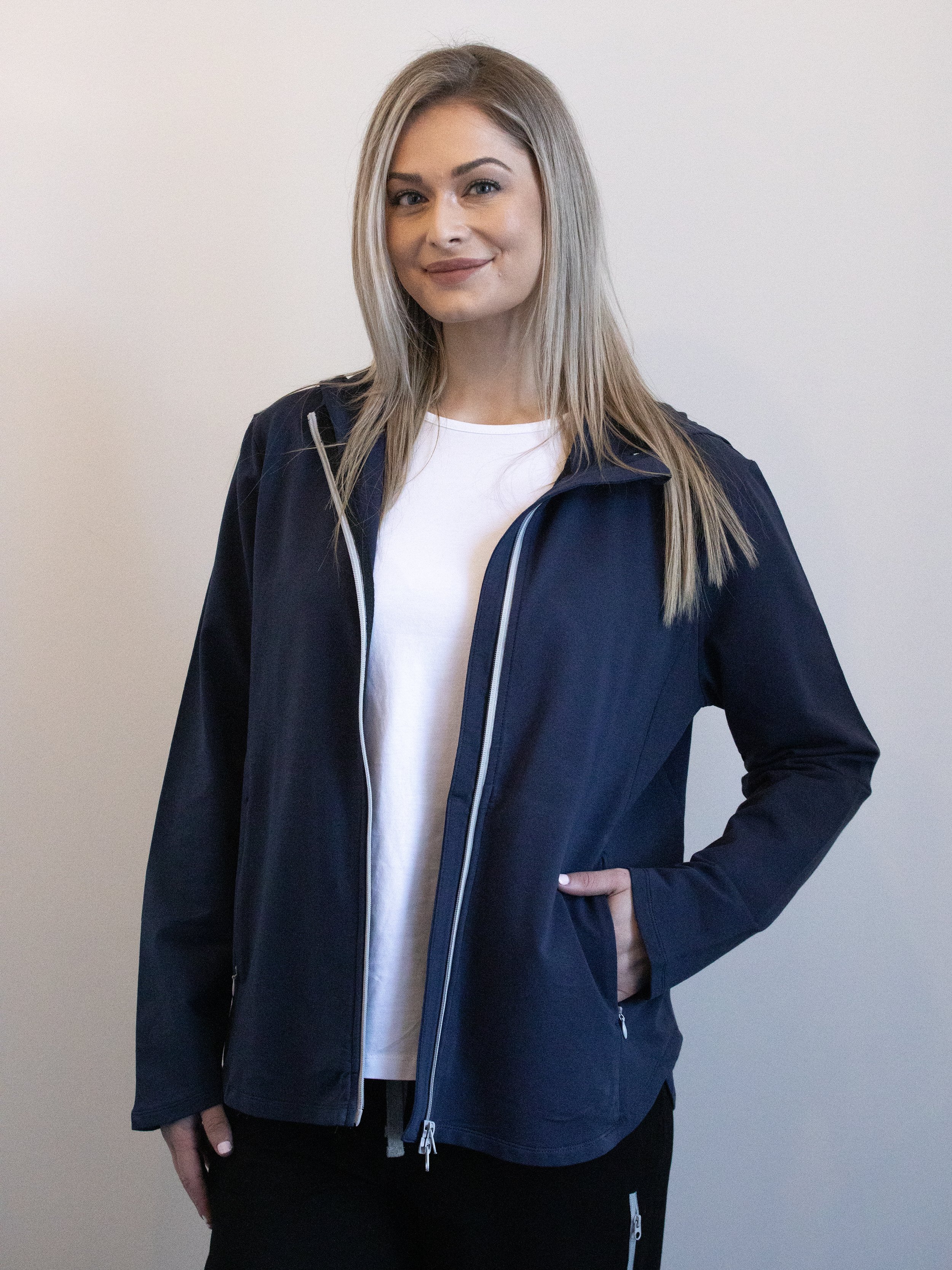 Zip up hooded jacket with front zipped pockets and a cross over side split.