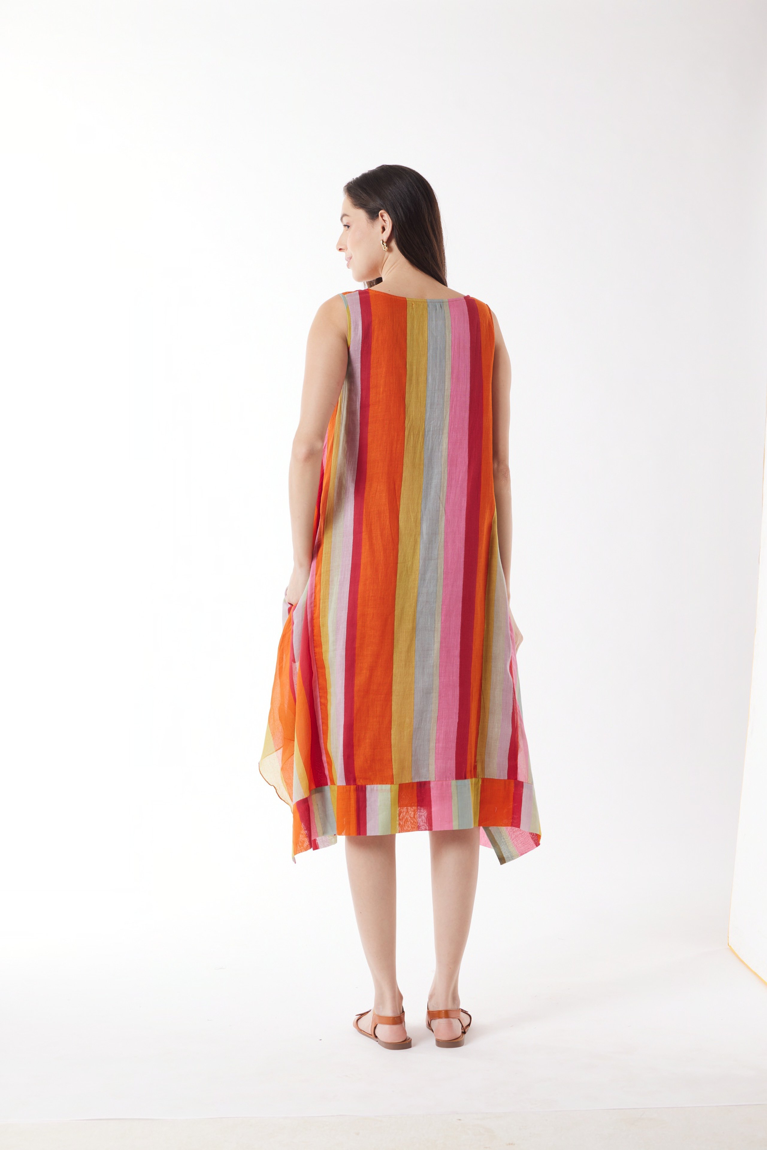 Light weight lined dress with side pockets and pin tucks on either side of the dress.