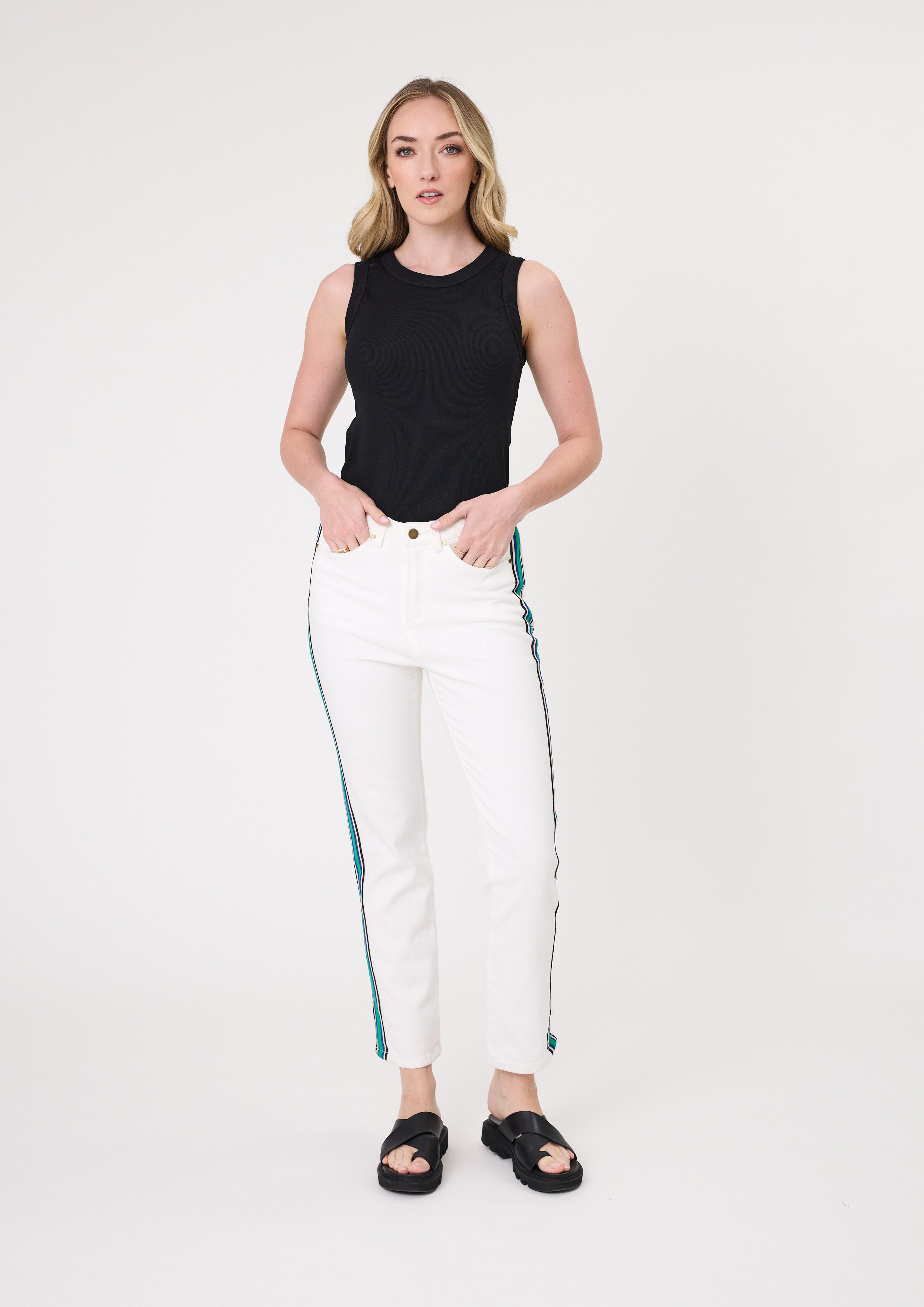 Available in denim and off-white with bold striped cotton tape on the sides.