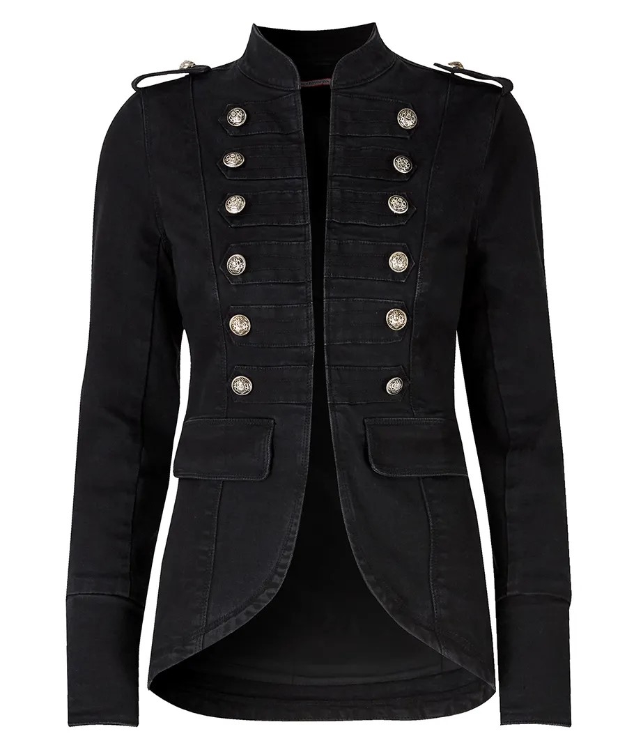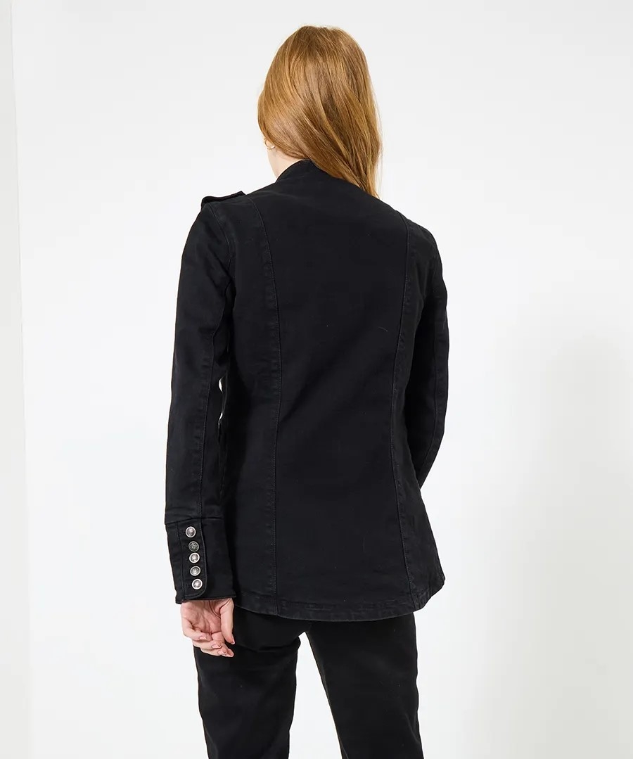 This military-inspired women's jacket will quickly become a favourite in your wardrobe. Classic denim in a new, refined style, it's perfect for events and your next night out. With authentic epaulettes and a deep black wash for versatility, it'll create standout looks with all your seasonal staples, from jeans to skirts and dresses.