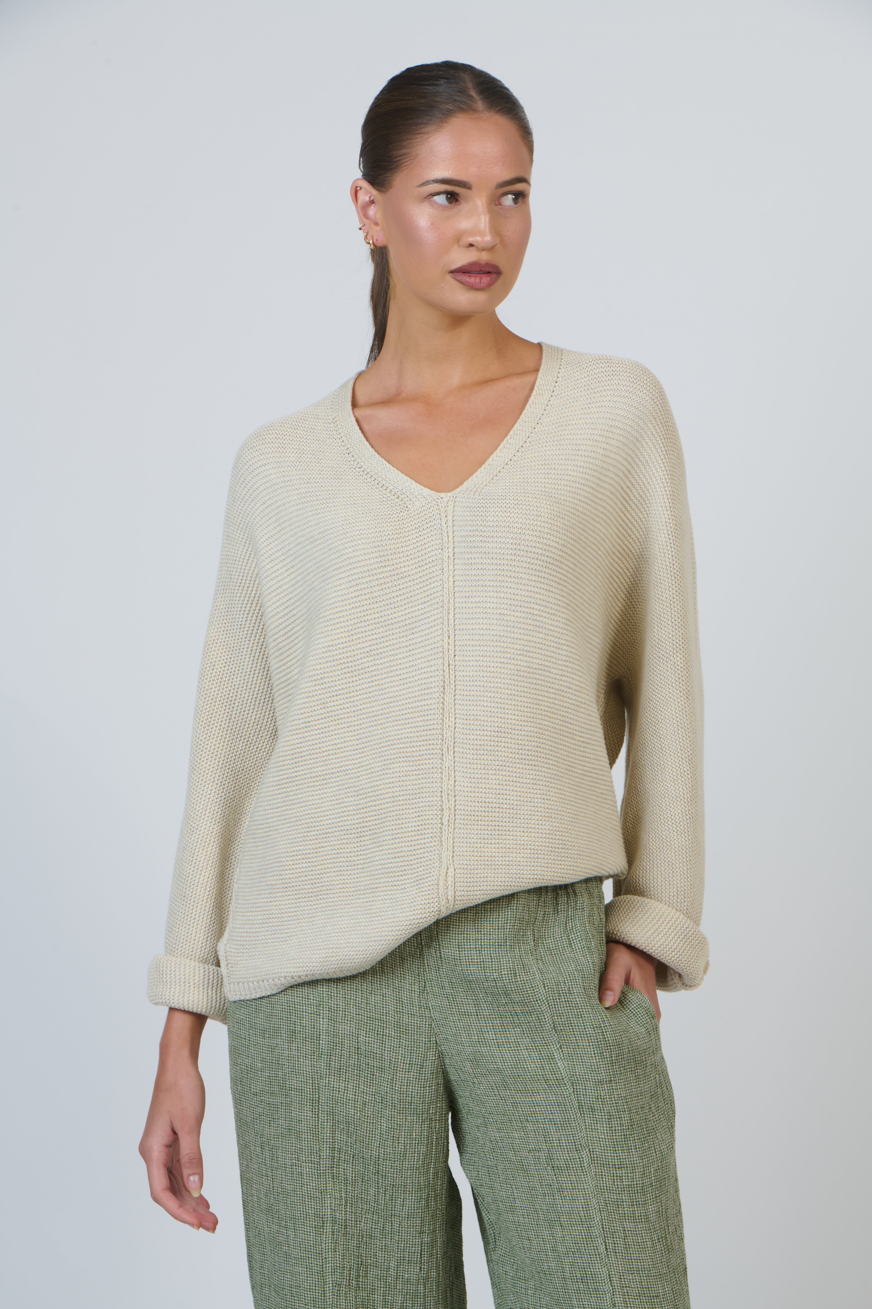 This is the kind of jumper you slip on and instantly feel at ease. Its flattering V-neckline and dropshoulders create a loose, easy silhouette. The chunky rib knit offers texture while staying comfortable. Rolled cuffs add a subtle, casual detail. A versatile piece made for simple, everyday layering.
