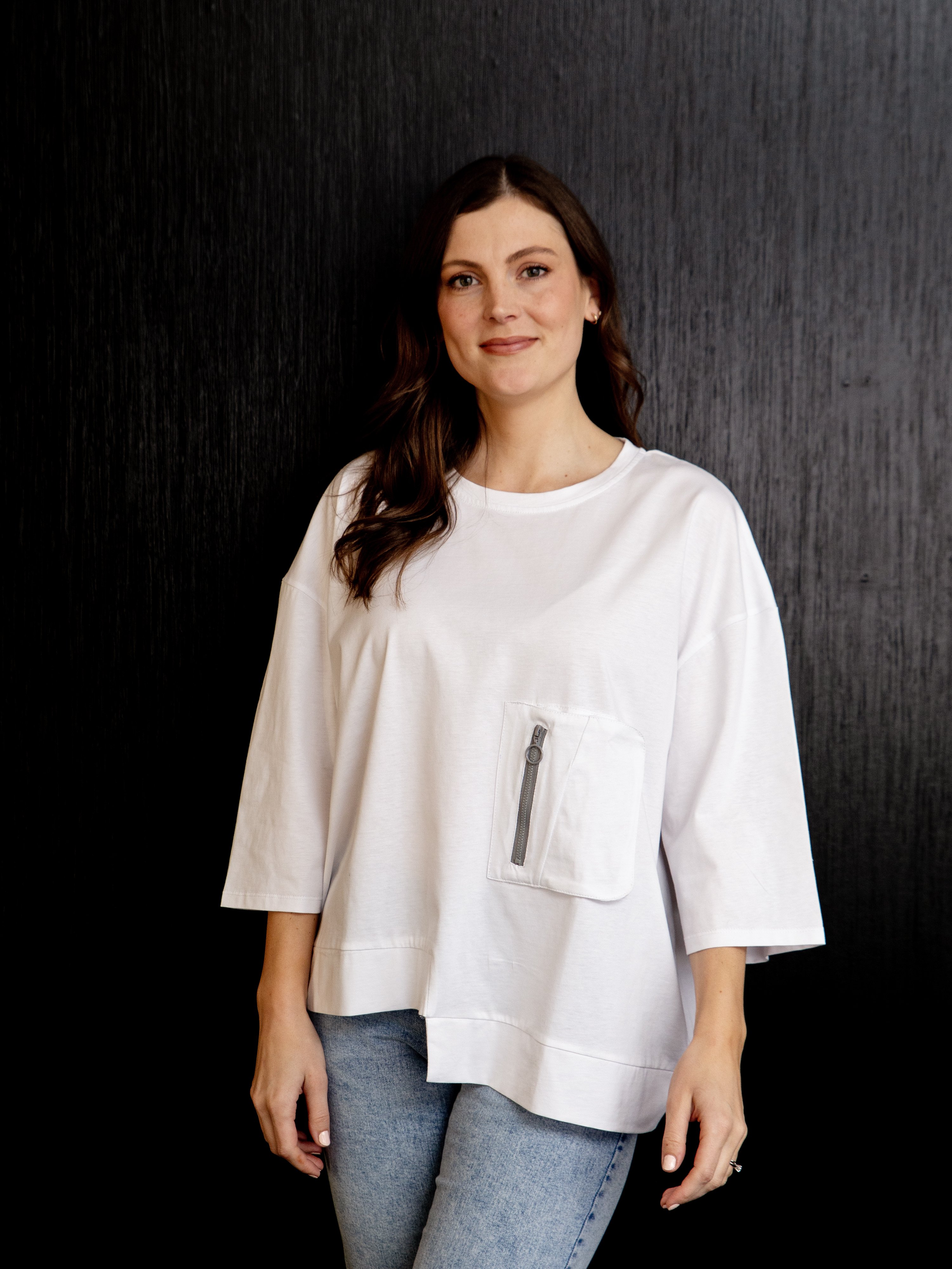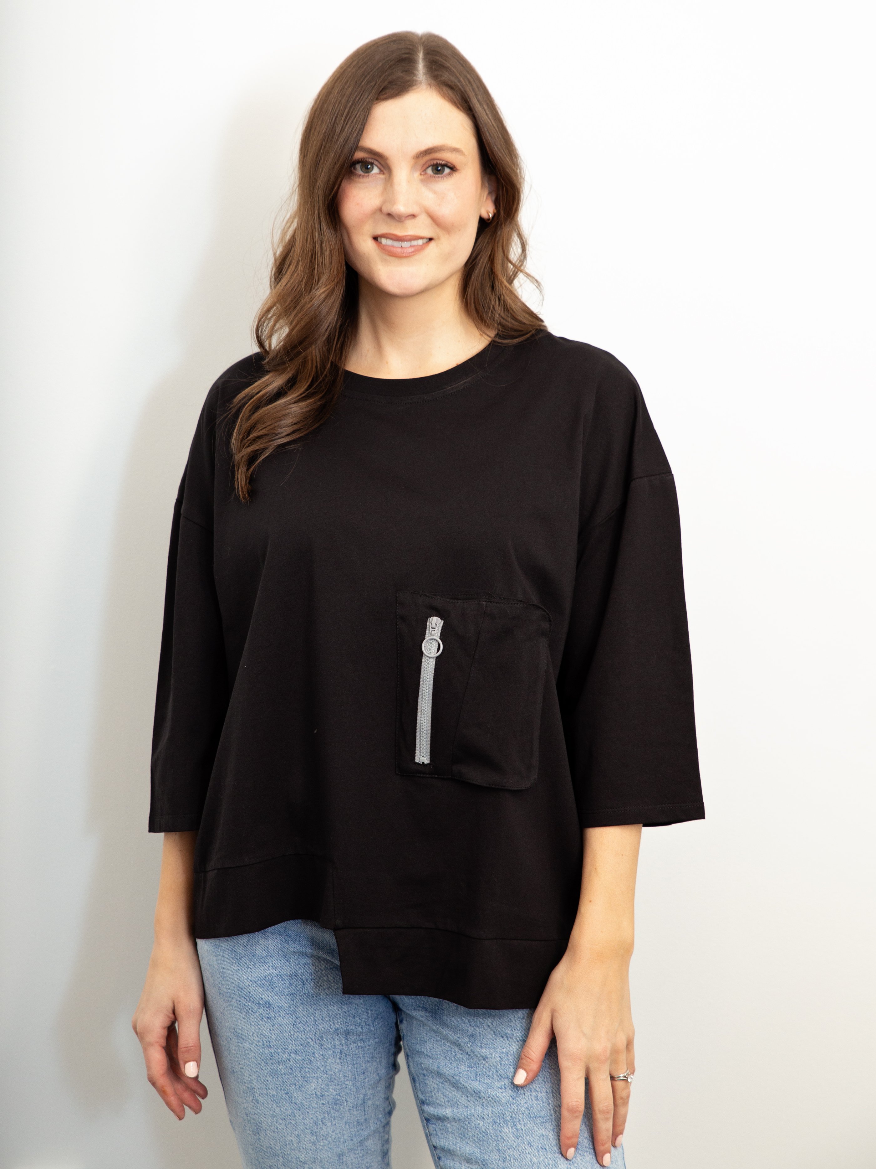 Relaxed fitting top with a stepped hem and front pocket detail.